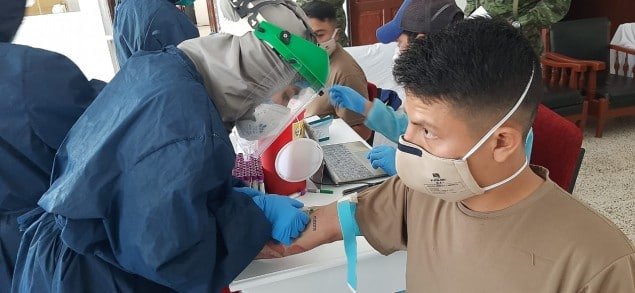 Asimismo, para precautelar la integridad de los soldados, en las unidades militares del país se está realizando la toma de pruebas de contagio por COVID-19 al personal militar, es así que en el Oriente ecuatoriano, el Batallón de Selva N.° 61 Santiago, en coordinación con el Ministerio de Salud Pública, lo viene realizando al personal militar que se encuentra ejecutando operaciones militares en el cantón Morona; de igual manera, en convenio con el Laboratorio Oncolab se realizaron 125 pruebas al personal del Grupo de Fuerzas Especiales N.° 53 Rayo y de la Brigada de Selva N.° 19 Napo, que tienen bajo su responsabilidad la seguridad de los cantones Cuyabeno, Cascales, Putumayo, Lago Agrio, Sucumbíos y Gonzalo Pizarro. También, la Dirección de Sanidad del Ejército efectuó la toma de pruebas rápidas en el Batallón de Infantería Motorizada N.º 20 Capitán Díaz y en el Batallón de Infantería Motorizada N.° 19 Carchi, en la provincia de Loja, y en el Batallón de Infantería Motorizado N.° 14 Marañón, en Libertad.