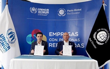 Este compromiso, suscrito por Giovanni Bassu, Representante de la ACNUR en Ecuador y Julio Moreno Espinosa, Presidente de Pacto Global de Naciones Unidas Red Ecuador, fomentará nuevas iniciativas para sensibilizar al sector privado sobre los beneficios de la integración de las personas refugiadas y migrantes a las cadenas de valor y al mercado laboral, promoviendo espacios de encuentro entre oferta y demanda (de oportunidades de empleo, capacitaciones, compras inclusivas) entre el sector privado, organizaciones de apoyo y las personas refugiadas y migrantes.
