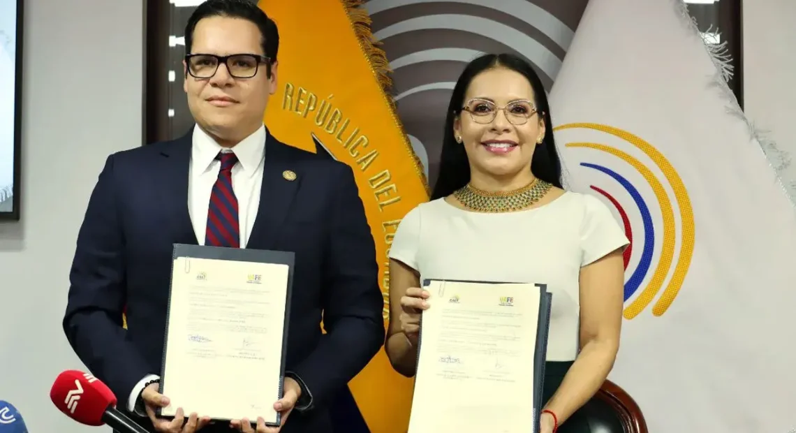Quito.- La presidenta del Consejo Nacional Electoral (CNE), Diana Atamaint, y el director de la Unidad de Análisis Financiero y Económico (UAFE), José Julio Neira, suscribieron este 19 de noviembre un convenio de cooperación interinstitucional, en el marco de las Elecciones Generales 2025.