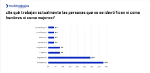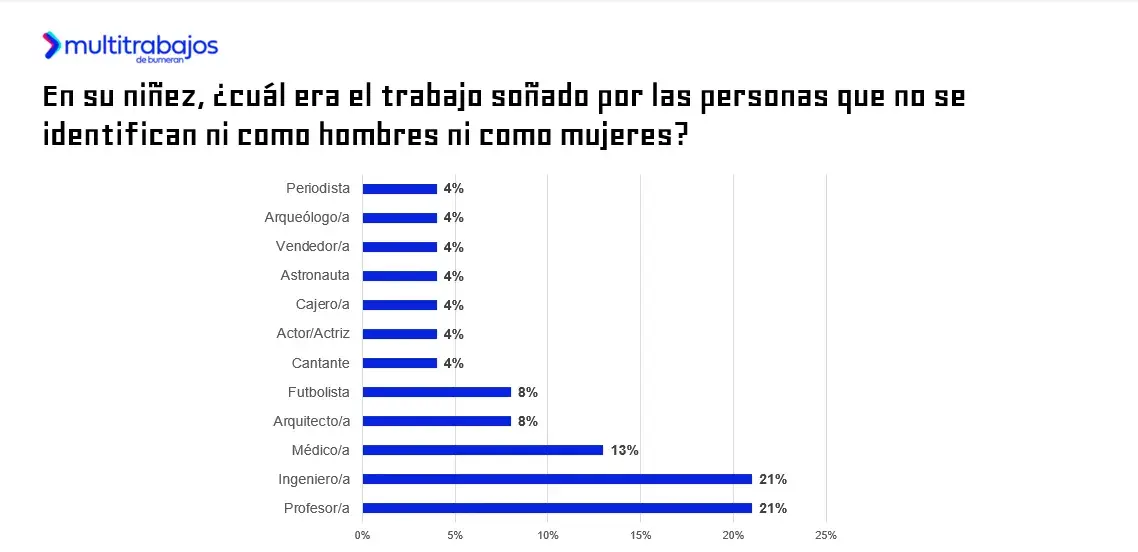 Entre las personas que no se identifican ni con el género femenino ni masculino, el 21% soñaba con ser profesor/a e ingeniero/a; el 13% con ser médico/a; y el 8% con ser arquitecto/a y futbolista.