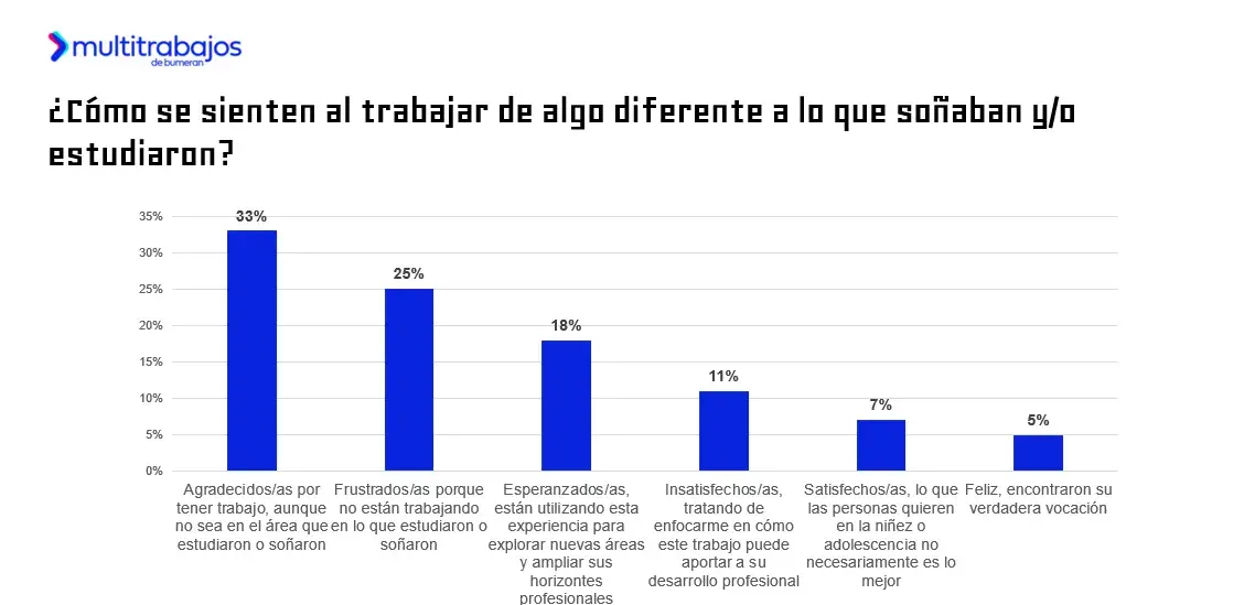 Entre quienes no trabajan de algo relacionado con lo que estudiaron, el 33% se siente agradecido por tener empleo, aunque no sea en su área de formación o profesión soñada; el 25% se siente frustrado/a por no ejercer en lo que estudió o soñó; y el 18% se muestra esperanzado/a y desarrolla su trabajo actual con la idea de explorar nuevas áreas y ampliar sus horizontes profesionales.