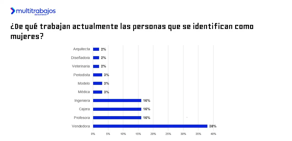 ¿A qué se dedican actualmente? El 38% trabaja como vendedora; el 16% como profesora, cajera e ingeniera; y el 3% como médica, modelo y periodista. Solo un 2% trabaja como veterinaria, diseñadora y arquitecta.