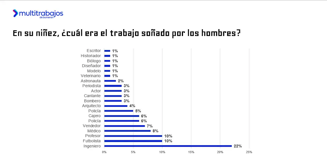 Entre quienes se identifican como hombres, el 22% soñaba con ser ingeniero; el 10% con convertirse en futbolista y profesor; un 8% deseaba ser médico; y otro 7% aspiraba a ser vendedor.