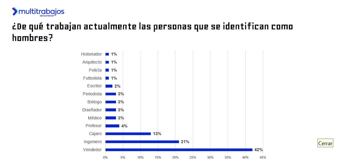 Actualmente, el 38% trabaja como vendedor/a; el 29% como ingeniero/a; y el 8% como cajero/a y arquitecto/a. Con un porcentaje menor del 4% se encuentra los trabajos de profesor/a, médico/a, diseñador/a y arqueólogo/a.