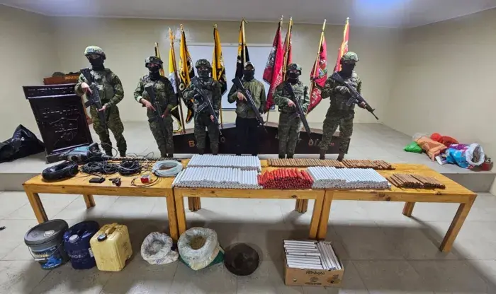 Además, se decomisaron armas de fuego, municiones y una considerable cantidad de explosivos industriales y artesanales, incluyendo emulsiones explosivas de distintas marcas, fulminantes, mechas de seguridad y sustancias como nitrato de amonio y ANFO.