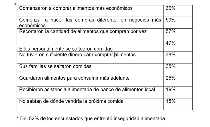 El 66% manifestó que empezó a comprar alimentos más económicos de los que antes compraba, mientras que el 38% dijo que no tenía dinero suficiente para comprar alimentos y el 15% dijo no saber de dónde vendría su próxima comida.