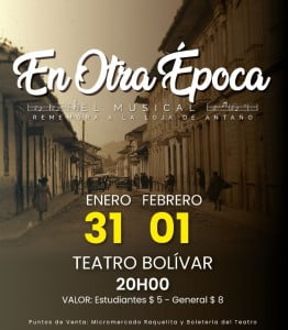 Loja.- En otra época el musical que nos lleva a rememorar el Loja de antaño costumbres, cultura, música personajes y escenarios que han hecho historia en Loja, es la propuesta de Hiroshi Smouse Fernández y Jack Daniel Paz Cárdenas que la ponen en escena este 31 de enero y 1 de febrero del presente año, en el Teatro Universitario Bolívar.
