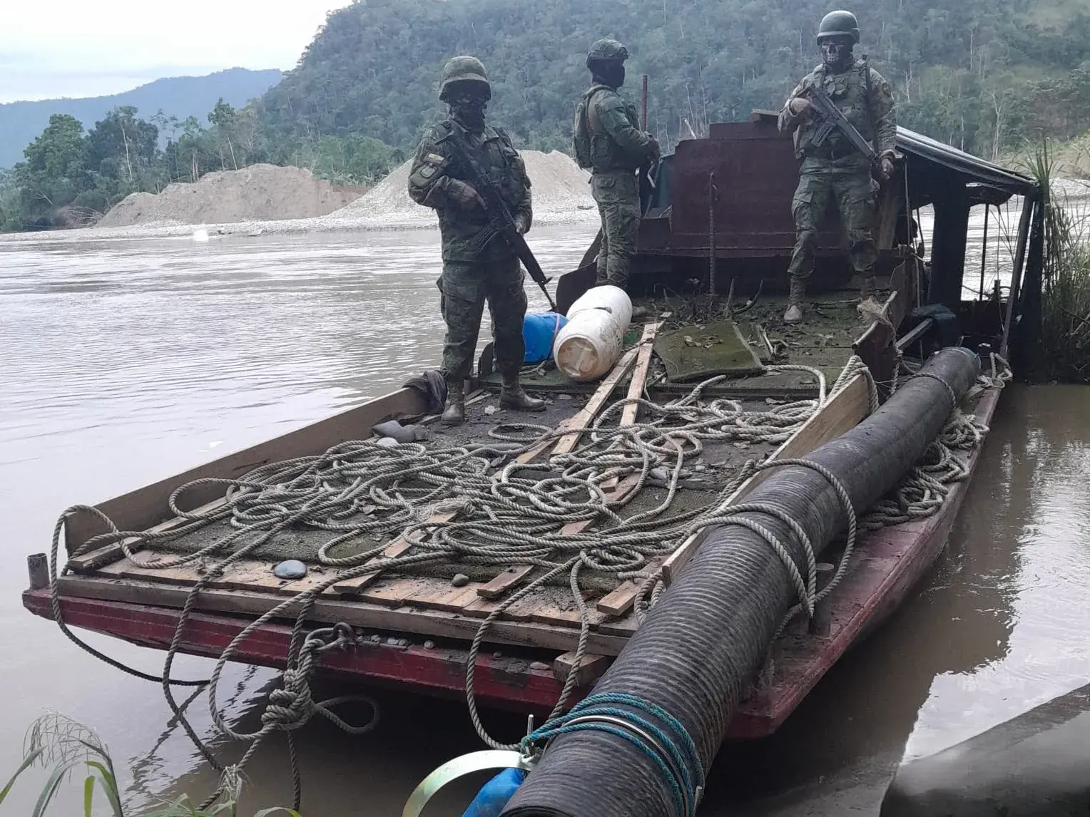 ZamoraChinchipe.- Efectivos del Batallón de Selva N.º 63 Gualaquiza realizaron una operación contra la minería ilegal en el sector Las Peñas, río Zamora, donde junto al personal de la Agencia de Regulación y Control de Energía y Recursos Naturales no Renovables (ARCERNNR) se procedió a inutilizar el siguiente material: 1 draga, 1 excavadora, 1 clasificadora, 2 motores, 1 cisterna, 1 bomba de succión, 1 compresor de oxígeno, 250 galones de combustible, además, herramientas y accesorios usados en las actividades de minería ilegal.