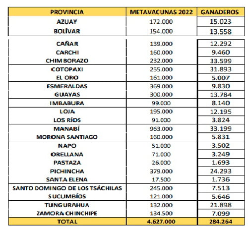 Ecuador mantiene un invicto de 11 años sin fiebre aftosa. Eso permite que las exportaciones pecuarias a países de América Latina, Asia y El Caribe se mantengan gracias a la calidad y salud del ganado ecuatoriano. Este año se invertirá aproximadamente 5,5 millones de dólares para la campaña de vacunación.