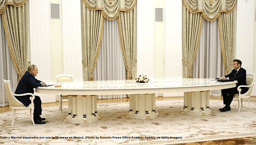 Una sala blanca sin ningún color cálido, un saludo a distancia y una mesa de varios metros que separaba a Putin y a Macron, un reflejo visible de la distancia que había entre las posturas de los dos. Curiosamente la extensión de la mesa era para evitar contagios covid, pero es notorio que Putin jamás se pone la mascarilla, por lo que no puede ser interpretado como un gesto más.