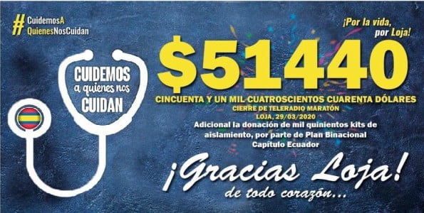 Loja.- Bajo la organización de la Federación de gremios Profesionales, del Colegio de Médicos de Loja y 31 medios de comunicación con señal abierta y digitales de la provincia, desde las 11H00 hasta las 21H00, participaron de la tele radio maratón “Cuidemos a quienes nos cuidad”, el mismo que recaudó 51 mil dólares americanos, que servirán para la compra de 100 kits médicos.