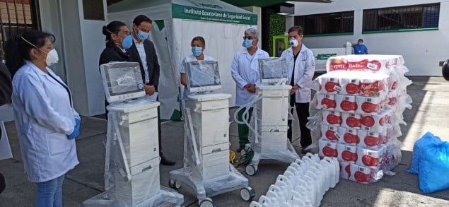 Cuenca.- Con gran expectativa esperaron los médicos, enfermeras y resto de personal de salud quienes recibieron los tan necesarios respiradores mecánicos. Un total de 3 respiradores o ventiladores mecánicos fueron entregados a los representantes del Hospital José Carrasco Arteaga del IESS, así como también 2 respirados o ventiladores al Hospital Regional Vicente Corral Moscoso, sumado a esto 1000 mascarillas N95, 30 trajes de protección antifluidos (reutilizables), 25 galones de alcohol desinfectante y 20 pacas de papel higiénico a cada hospital, respectivamente.