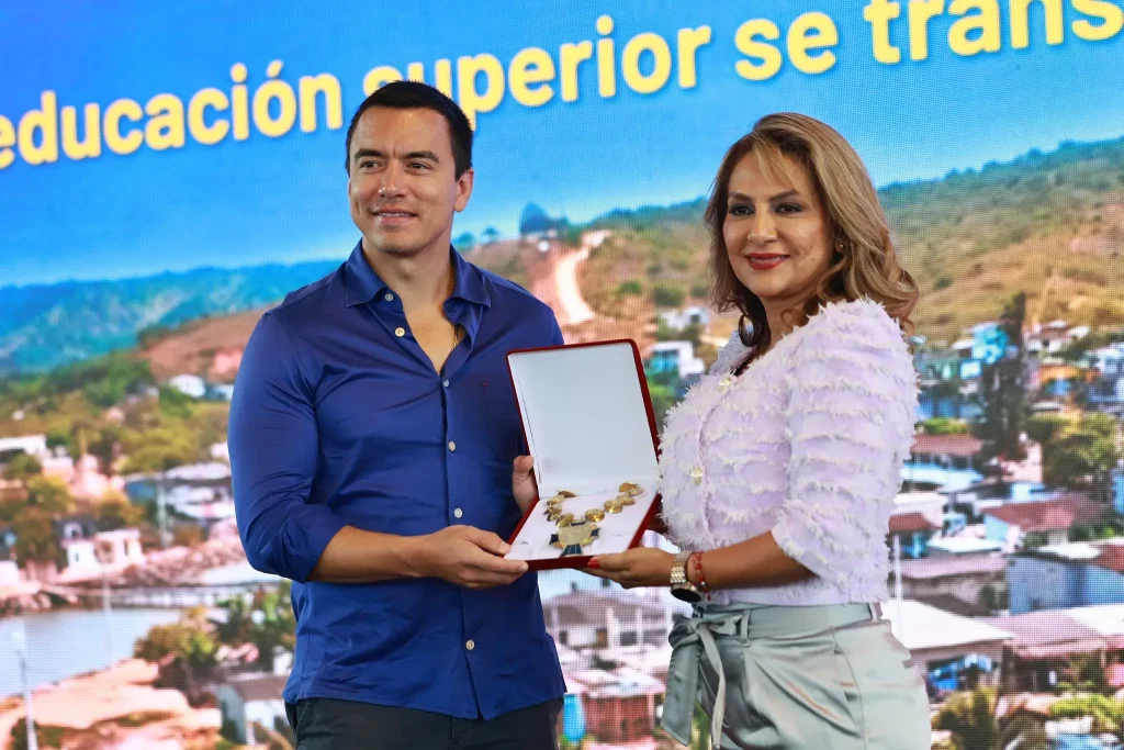 Santa Elena.- El Presidente Daniel Noboa Azín, recibió la condecoración “Matilde Hidalgo de Procel” al Mérito Educativo y Social, por parte de los becarios de educación superior. Este galardón es un gesto de respaldo a la gestión del Primer Mandatario quien, con firme voluntad política, ha entregado más de 409.000 becas que han transformado vidas en todo el Ecuador.