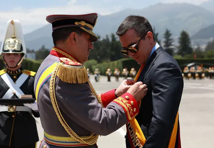Como parte del protocolo, el presidente Noboa recibió el Botón de Mando y fue condecorado con la distinción “Vencedores de Tarqui”, en el grado de Gran Cruz, reconocimiento que resalta su apoyo al fortalecimiento de la defensa nacional y a las labores orientadas a garantizar la paz y la seguridad ciudadana.
