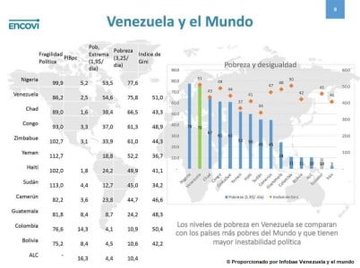 “Los niveles de pobreza en Venezuela se comparan con los países más pobres del mundo y que tienen mayor inestabilidad política”, afirma el estudio, que compara a la nación caribeña con países como Nigeria, Chad, Congo y Zimbabue.