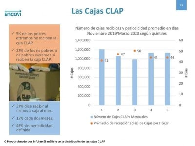Según el informe, “el 5% de los pobres extremos no reciben la caja CLAP”, mientras que “el 22% de los no pobres o no pobres extremos sí la reciben”. Además, el 39% de los preguntados afirmó recibir al menos una caja al mes, el 15% cada dos meses y el 46% sin periodicidad definida.