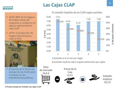 En otro orden, el estudio hizo un análisis sobre los Comités Locales de Abastecimiento y Producción, más conocidos como CLAP, que el régimen de Nicolás Maduro utiliza como herramienta para la propaganda política y el control social.
