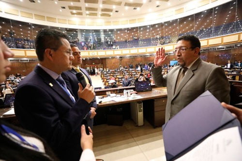 Quito.- El Asambleísta Darwin Pereira integrante de la Comisión Administrativa Legislativa (CAL), tomó el juramento y posesiono al Asambleísta Virgilio Saquicela como Presidente de la Asamblea Nacional.